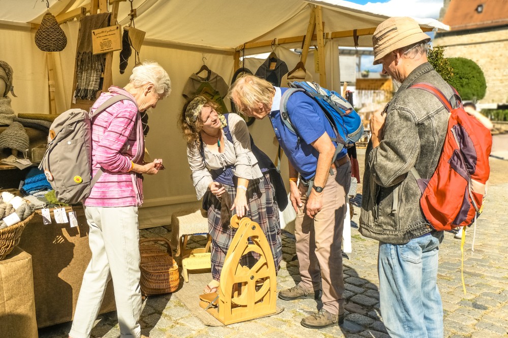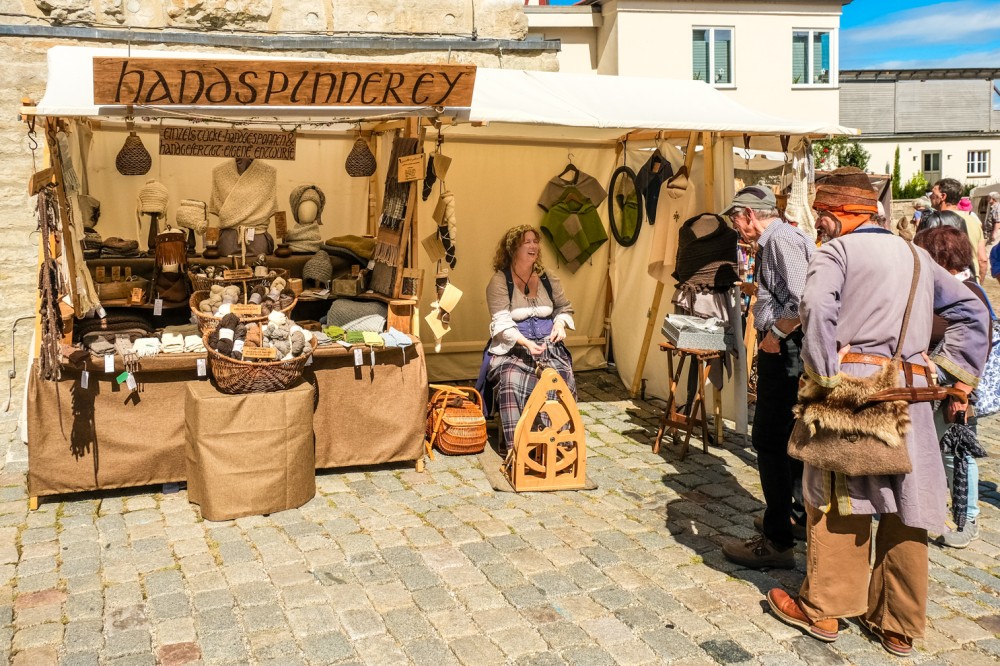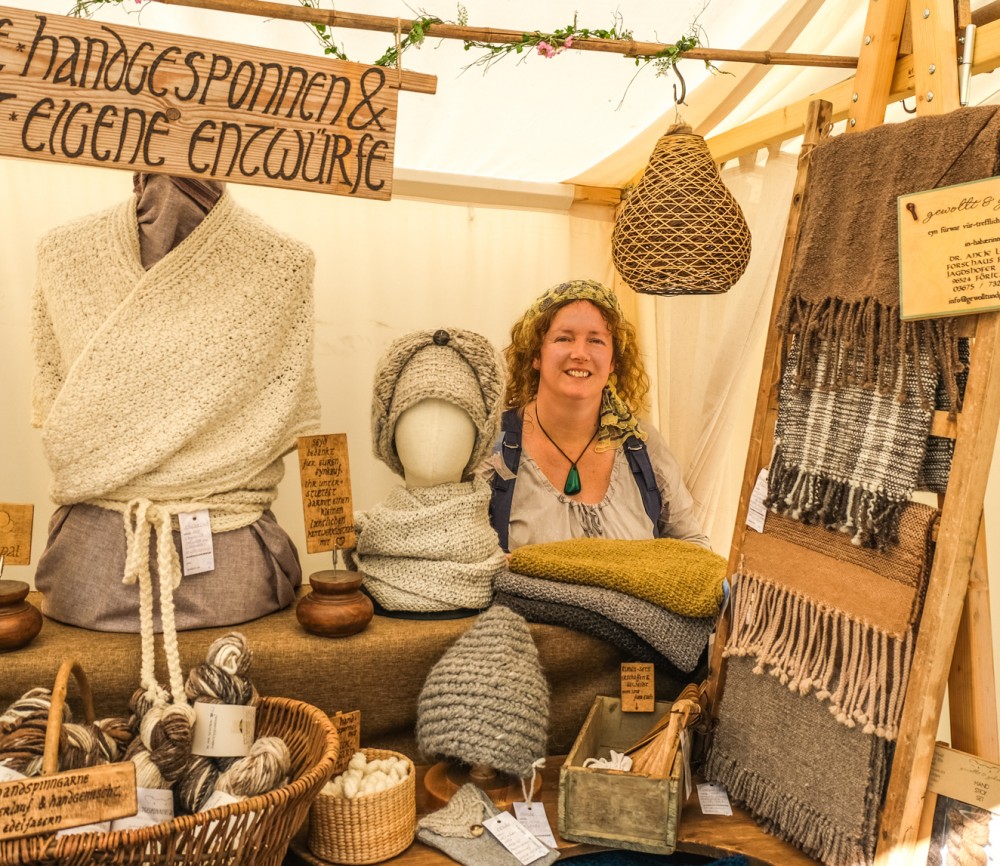 Ganzjährig biete ich auf Mittelalter-, Handwerker- und Museumsmärkten darstellendes Handwerk (Spinnen mit dem Spinnrad, auf Anfrage auch Kardieren und Weben) sowie eine kleine Verkaufsausstellung ausschließlich mit meinen handgemachten Produkten.